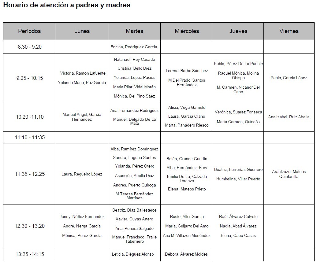 INFORMACIÓN DE INTERÉS / IMPORTANT INFORMATION » HORARIO ATENCIÓN PROFESORADO-FAMILIAS / Teacher Schedule to Meet Families.